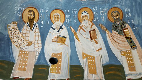 Свою работу в храме художники начали с алтаря. Палитра сложилась сама собой. «Две охры и рефть, смесь черного угля с белилами. Я люблю ограниченные палитры, в церкви такая аскетика важна», — рассказывает художница. Первым на прозрачно-сизом, словно воздушном, фоне был написан образ Богородицы. «Мне хотелось добиться эффекта движения в пространстве. Вот вы входите в церковь, идете к алтарю, и главная фигура Богородицы с покровом будто бы движется», — рассказывает Ирина Затуловская. Вокруг Богородицы появился сонм святых, среди них юродивый Василий Блаженный, московский патриарх Тихон, Андрей Юродивый с учеником Епифанием.