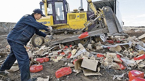 Ведомства в буквальном смысле поставили уничтожение продуктов на поток. Для разных находок свои методы. Партию овощей из нескольких ящиков заливают денатуратом или хлором и выкидывают в помойку. Если же ящиков на целую фуру, то их грузовиками вывозят на мусорные полигоны, где давят бульдозером и закапывают. Мясо зарывать нельзя по санитарным правилам - его жгут.
